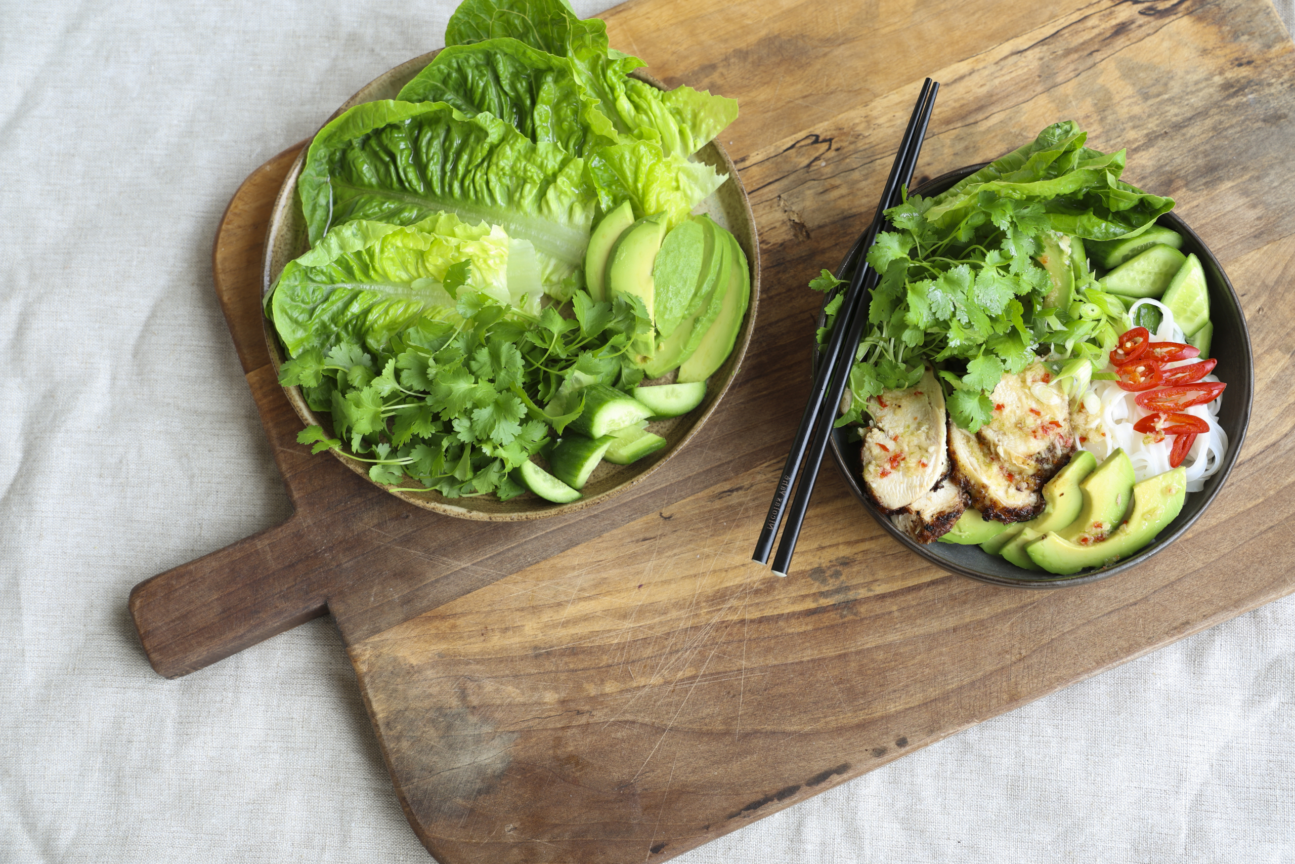Citrongræs kylling med fivespice, glasnudler, avocado og agurk