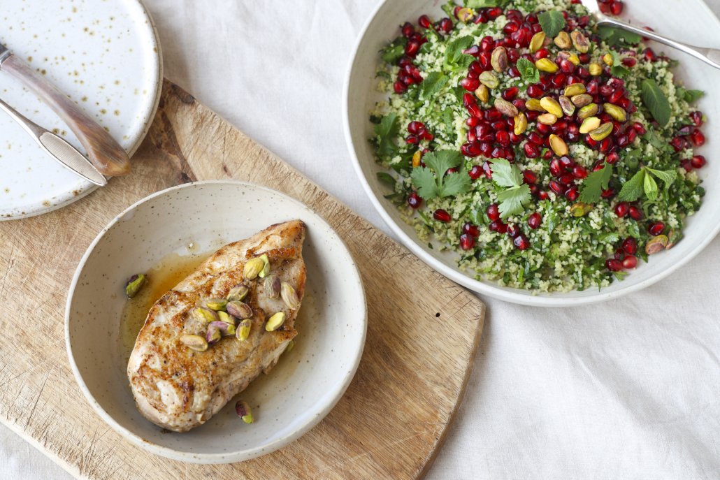 7. Lad kyllingebrystet hvile på en tallerken i 4-5 minutter. Pynt med et par pistacienødder på