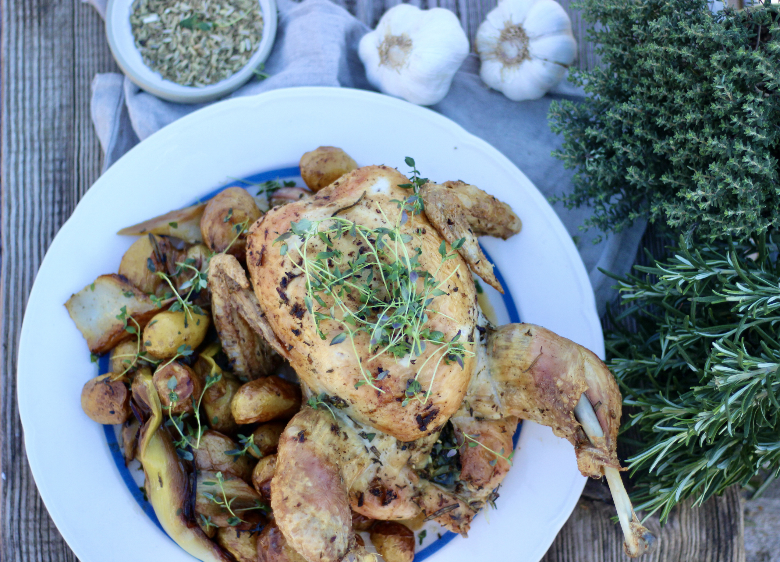 - Bind derefter kyllingen op med en kødsnor. Krydr kyllingeskindet med fennikelfrø, olivenolie, 4 fed knuste hvidløg, frisk timian og rosmarin.