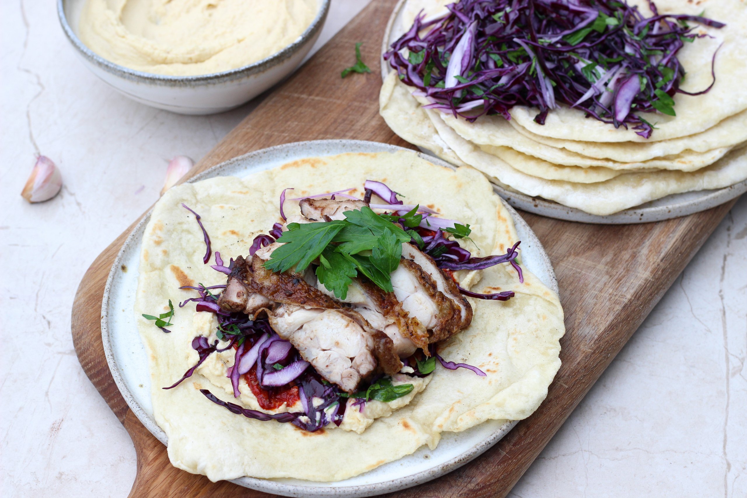 Super lækkert mørt kød i kombination med fintsnittet kål, hummus og fladbrød – det er bare lækkerier!
