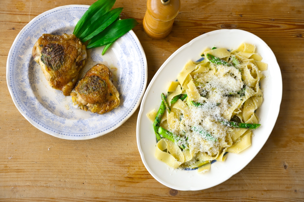 Kyllingeoverlår med pasta med ramsløg og asparges