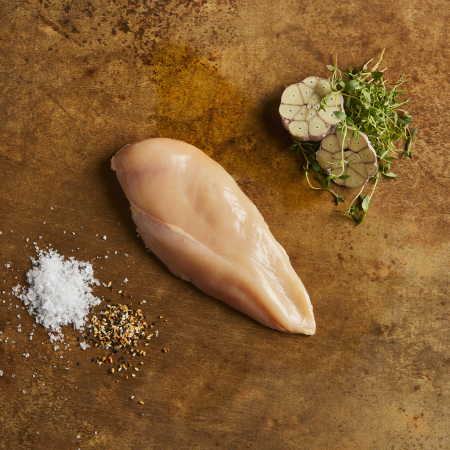 Fersk kyllingebrystfilet med skind. Klasse A. Opdrættet, slagtet og pakket i Danmark.