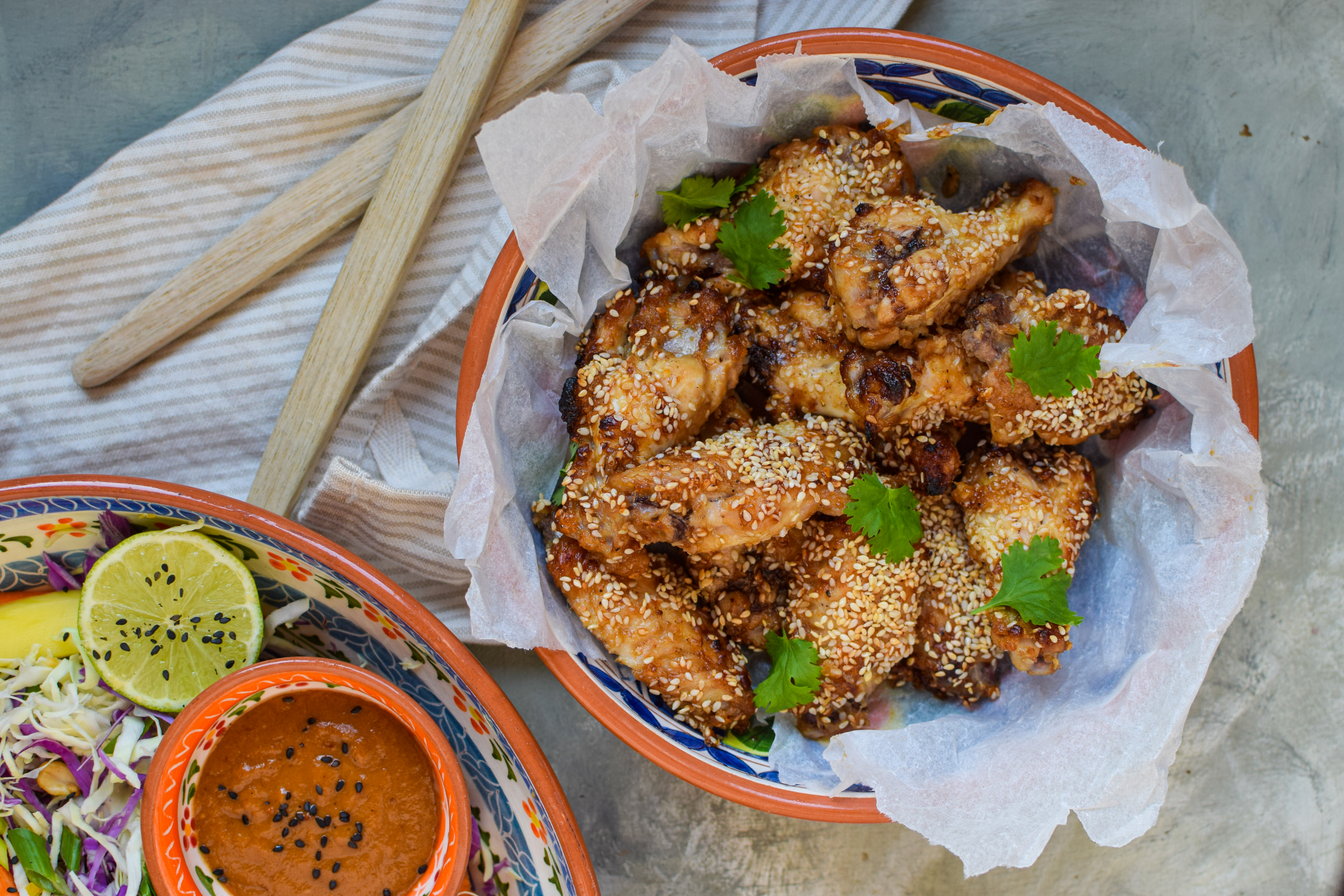 - Fordel vingerne i en bradepande med bagepapir, og drys med sesamfrø på begge sider.