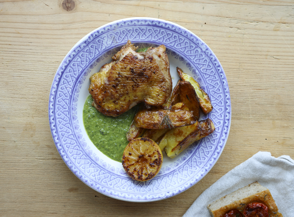 7. Servér kyllingen med sprøde kartofler, salsa verde og eventuelt en grillet citron.